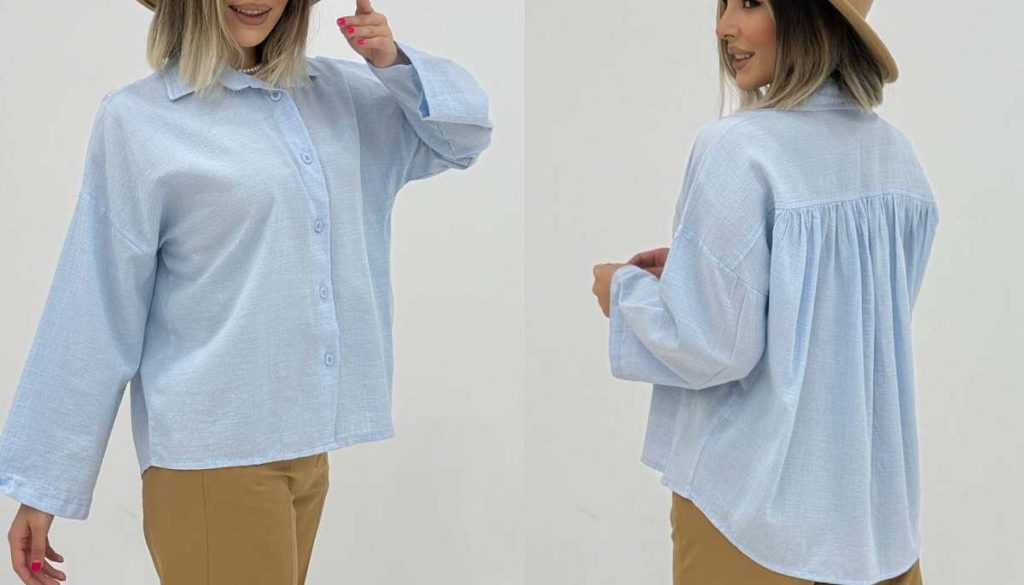 شومیز باکسی آبی روشن؛ یک مدل بسیار ظریف و شیک دخترانه با جزئیات چین روی آستین را حتما امتحان کنید زیرا یک لباس کاربردی و راحت است.